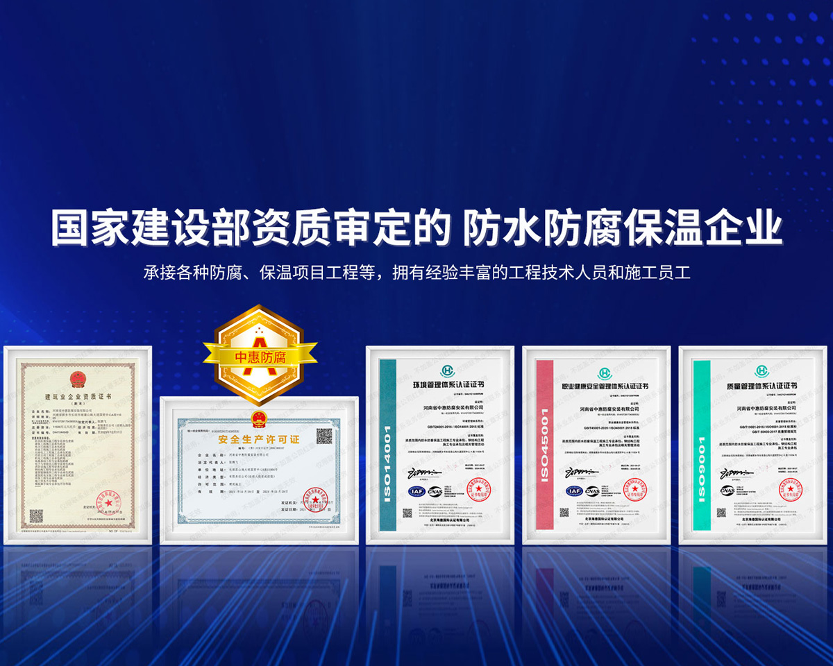 公司經營范圍:防水防腐保溫工程;消防設施工程;建筑裝修裝飾工程;建筑機電安裝工程;電力工程;建筑工程;石油化工工程;工業清洗工程;油罐清洗工程;鋼結構工程;環保工程;模板腳手架工程;電纜防火封堵、防污閃噴涂、外墻外保溫工程;各類施工勞務作業;設備維修、船舶鉚焊、涂裝;電力工程材料、建材、防水材料、防火材料、防腐保溫材料銷售,并相繼通過了GB/T19001-2008idtISO9001:2008GB/T50430-2007質量管理體系認證證書。GB/T24001-2004idtISO14001:2004環境管理體系認證證書。GB/T28001-2011idtOHSAS18001:2007職業健康安全管理體系認證證書。公司是中國防腐蝕于防護協會、中國施工企業管理協會、電力協會和中國鋼結構防水協會會員單位?! 」镜慕洜I業務涵蓋了石油、化工、電力、冶金、煤炭、船舶、國防、燃氣、水利、環保、交通運輸、航空及國防軍工和輕紡市政等行業的防腐保溫絕熱設備。鋼結構安裝、防火、防水、金屬噴鍍、聚脲噴繪、陰極保護、防滲透堵漏、玻璃鋼及各種磚版材料襯里、橡膠襯里、煙氣硫和耐酸溶劑腐蝕等工程施工。公司連續十年榮獲“省市先進施工企業”“安全生產先進單位”“重合同,守信用企業”和“AA***資質企業”的稱號。2000年被命名為市級文明單位,2002年被國家工商行政管理局命名為“重合同,守信用的企業”、被中國工業防腐蝕技術協會命名為“防腐蝕企業,能源節約及環境保護領域有豐富的經驗和***的業績。工程一次交驗合格率100%。其中攀枝花鋼鐵公司煉鐵廠四號高爐及熱風爐防腐工程、上海寶鋼公司煤氣柜防腐工程、撫順石油一廠裝置防腐項目、齊魯石化公司稀烴廠高塔防腐工程、吉林化學工業公司煉油廠油罐防腐工程、天津石化熱電廠六號爐頂棚聯絡管保溫工程、大慶油田(太倉)力神泵業工程、中國化學工程第十一建設工程、中原油田勘探局工程、中國石化銷售有限公司華北分部、魯皖輸油管道工程、貴州開磷息烽合成氨工程、陜西黃陵煤化工程、中國石油天然氣西部管道塔里木輸油工程、邯鋼集團邯寶鋼鐵公司煉鐵工程、德州供電工程、吉寶(南通)船廠工程,偃師華潤熱力工程、鄭州熱力總公司。 河南省中惠防腐安裝有限公司愿以豐富的施工經驗,***的技術,***的設備,***的管理,***的服務,竭誠為國內外廣大的用戶提供***滿意、******的工程作品?! ∥夜驹概c國內外同仁一道,團結協作,共同推進防腐蝕行業發展! 公司地址:河南省長垣縣建設路北段360號 固定電話:0373-8866488 郵編:453400 網址:http://www_zhff_com_cn.dingchangfrp.com